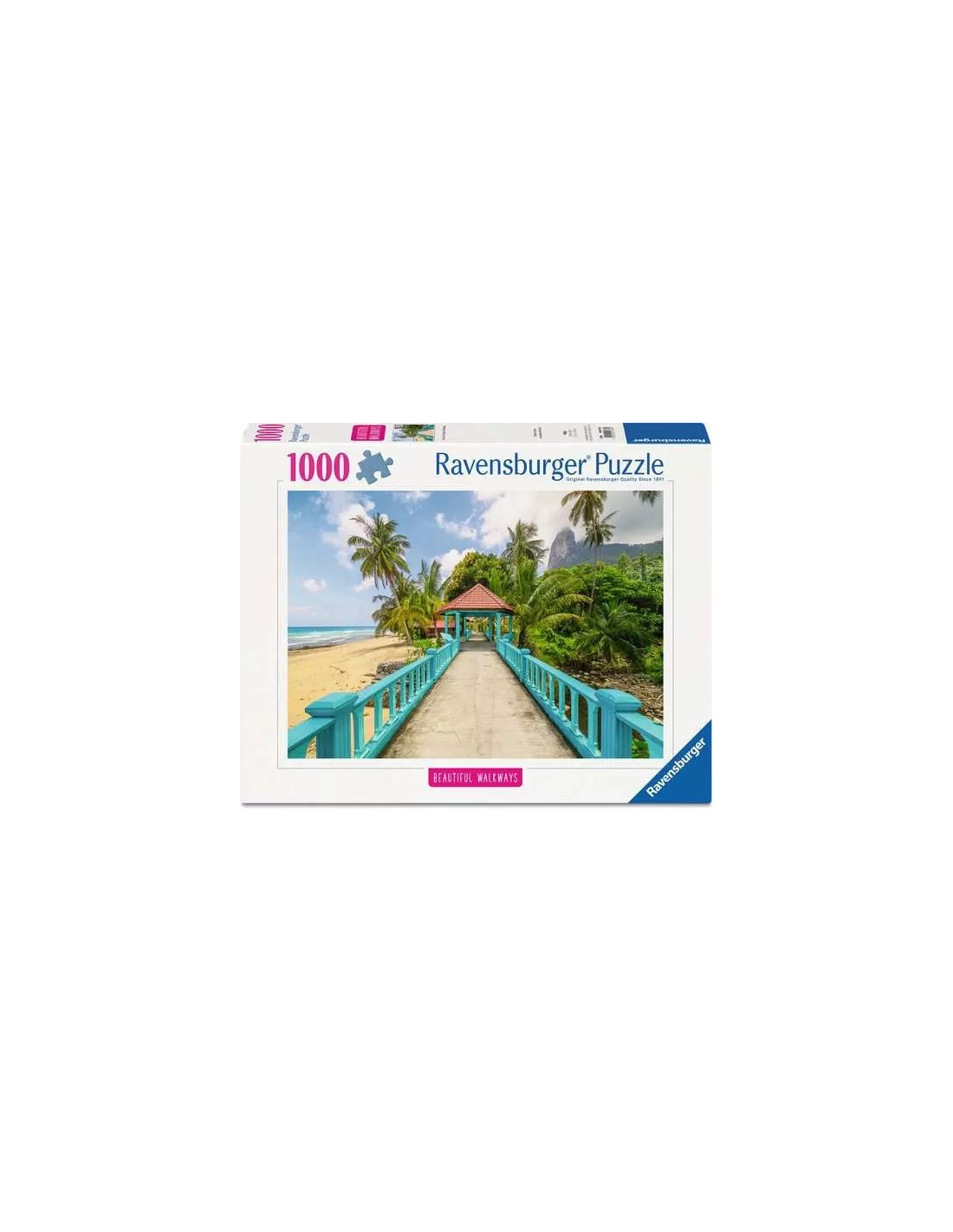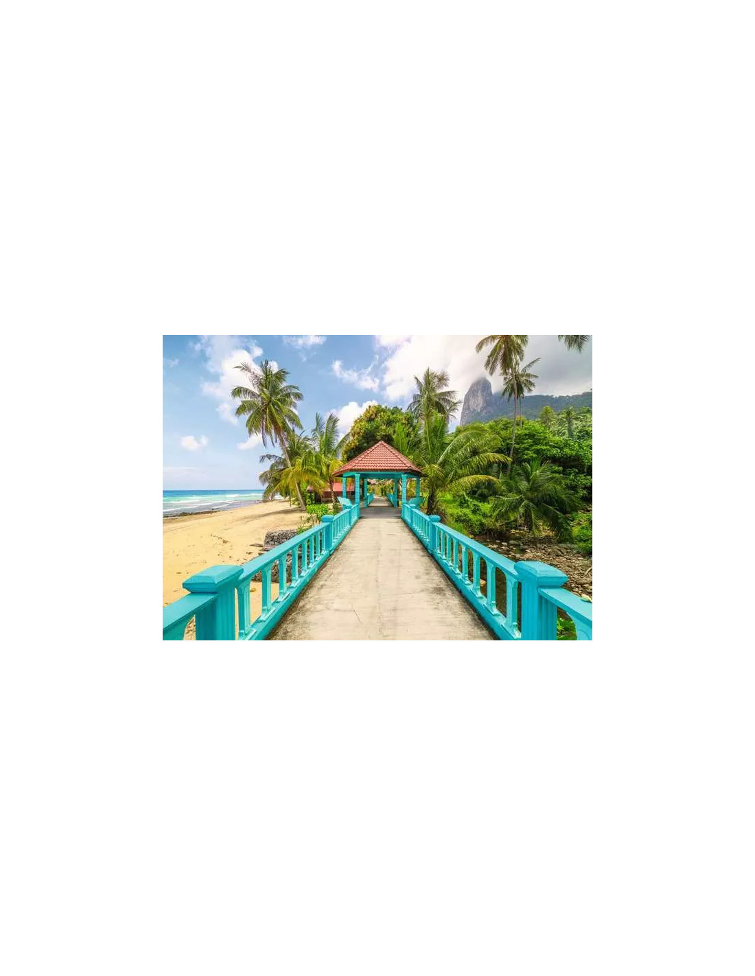 • Den fĂ€rgglada bron leder genom en tropisk oas med palmer och frodig vegetation. Den blĂ„ bron stĂ„r i kontrast till det gröna landskapet och den gyllene sandstranden