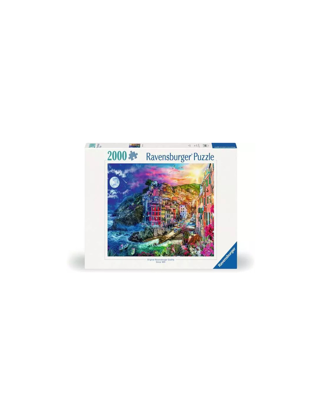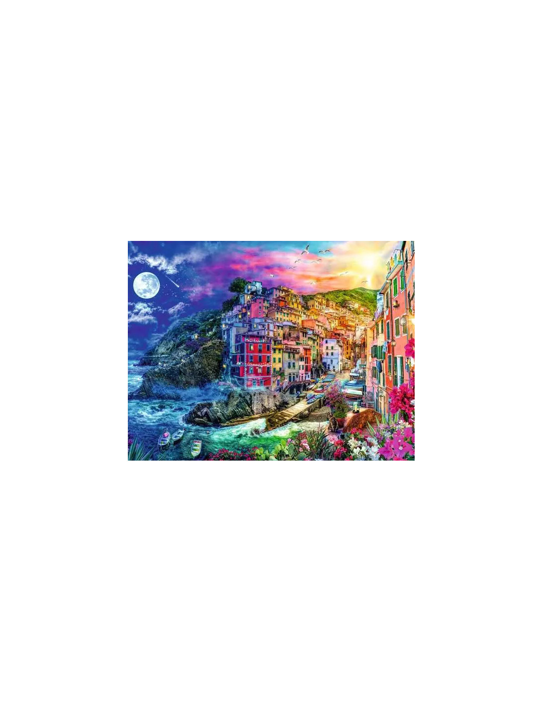 • Ett fĂ€rgstarkt portrĂ€tt av den lilla byn som ligger inbĂ€ddad i klipporna. Staden badar bĂ„de i solljus och mĂ„nsken, vilket skapar en magisk atmosfĂ€r.