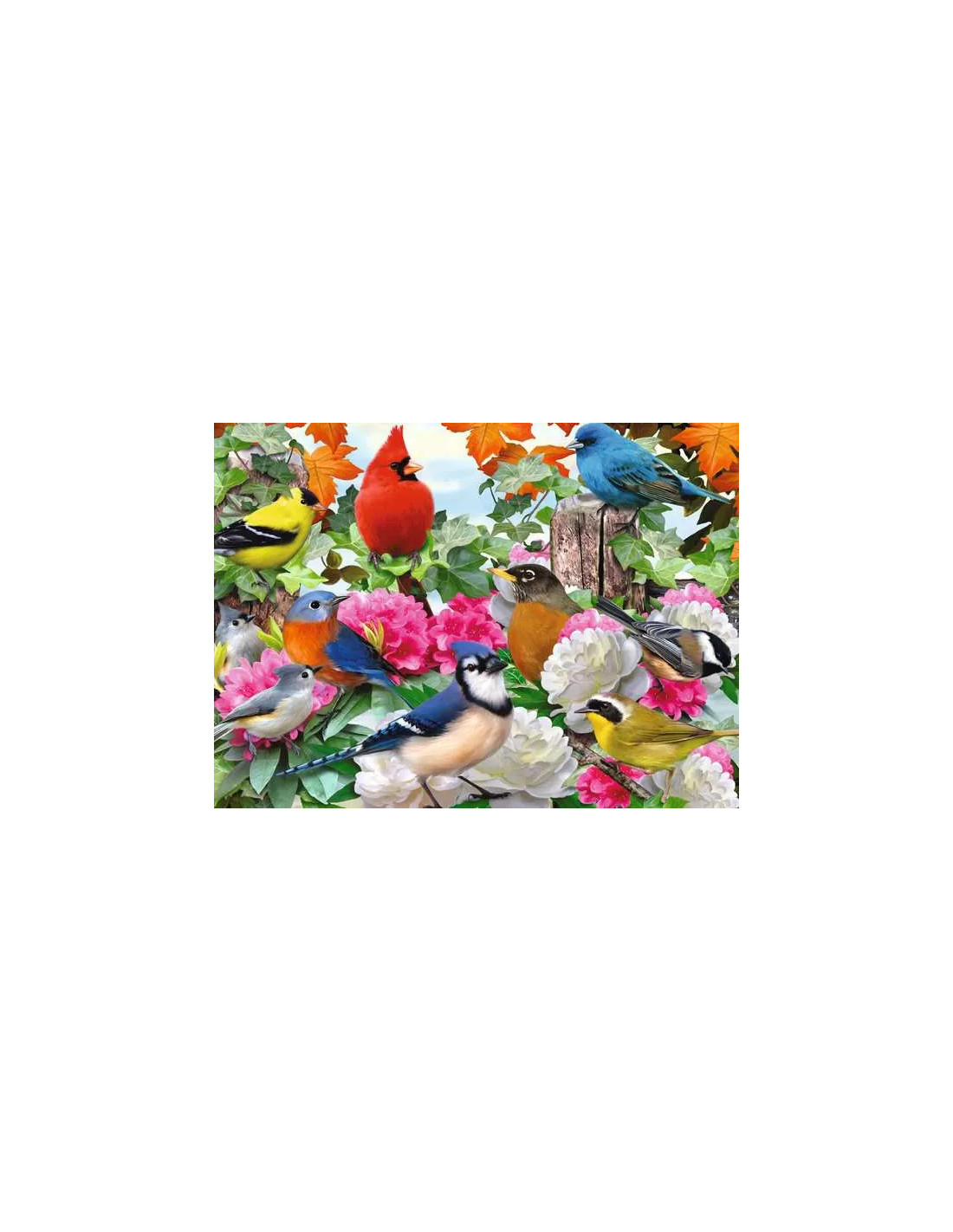 • TrĂ€dgĂ„rdens fĂ„glar omgivna av gröna blad och blommor