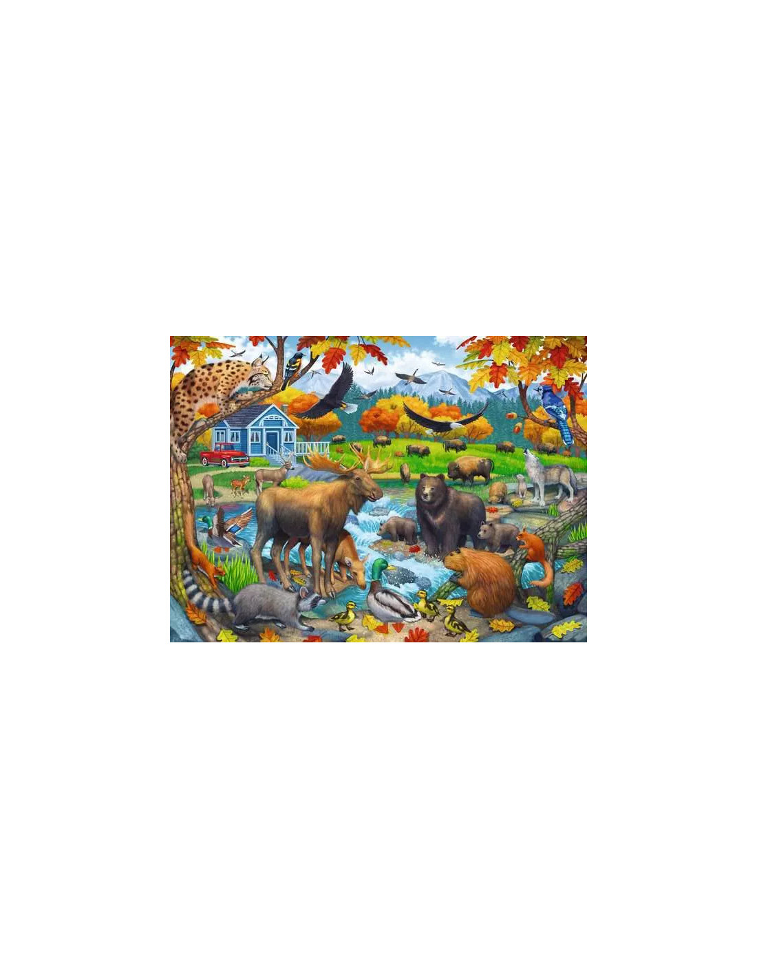 • En lĂ„ng rad vilda djur stĂ„r samlade runt en flod i höstfĂ€rger