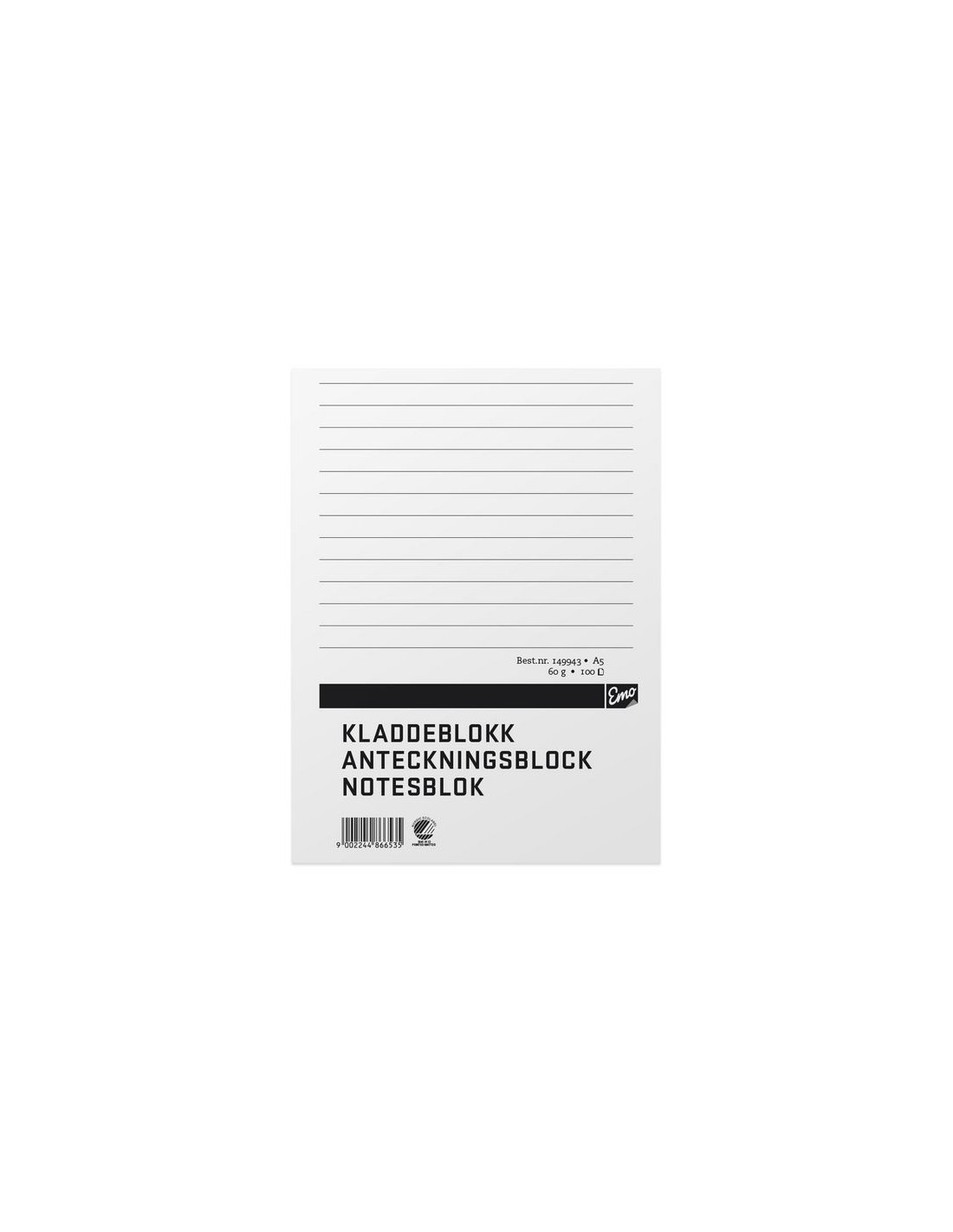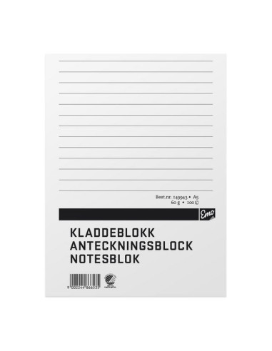 Anteckningsblock med en limmad kortsida upptill mot en stödskiva baktill för extra skrivstöd. Linjerat skrivpapper pÄ 60g.