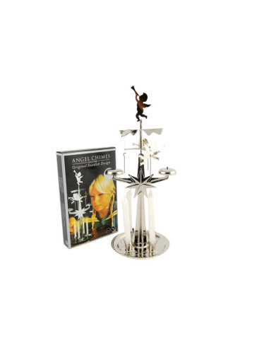 Det här är en silverfärgad variant av det klassiska originalet som är mässingsfärgat. Änglaspel Original är ett klassiskt och elegant änglaspel från Dala Industrier som ger den perfekta stämningen, exempelvis i juletider då många haft som tradition att ha ett änglaspel framme ända sedan dessa blev populära världen över efter andra världskriget. Änglaspelets höjd är cirka 28 centimeter, och det är gjord i pläterad stålplåt av god kvalitet. En uppsättning av ljus (fyra stycken) följer med i paketet. Änglaspel fungerar på så vis att värmen från brinnande ljust får en turbin med änglar att snurra, med pling från klockorna som resultat, och dessa pling skapar en slags enklare melodi