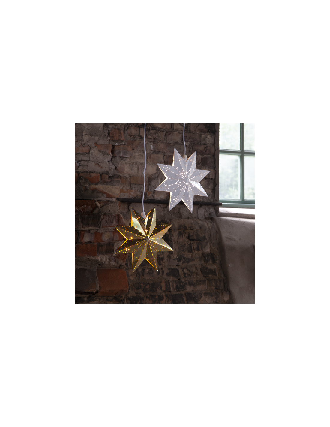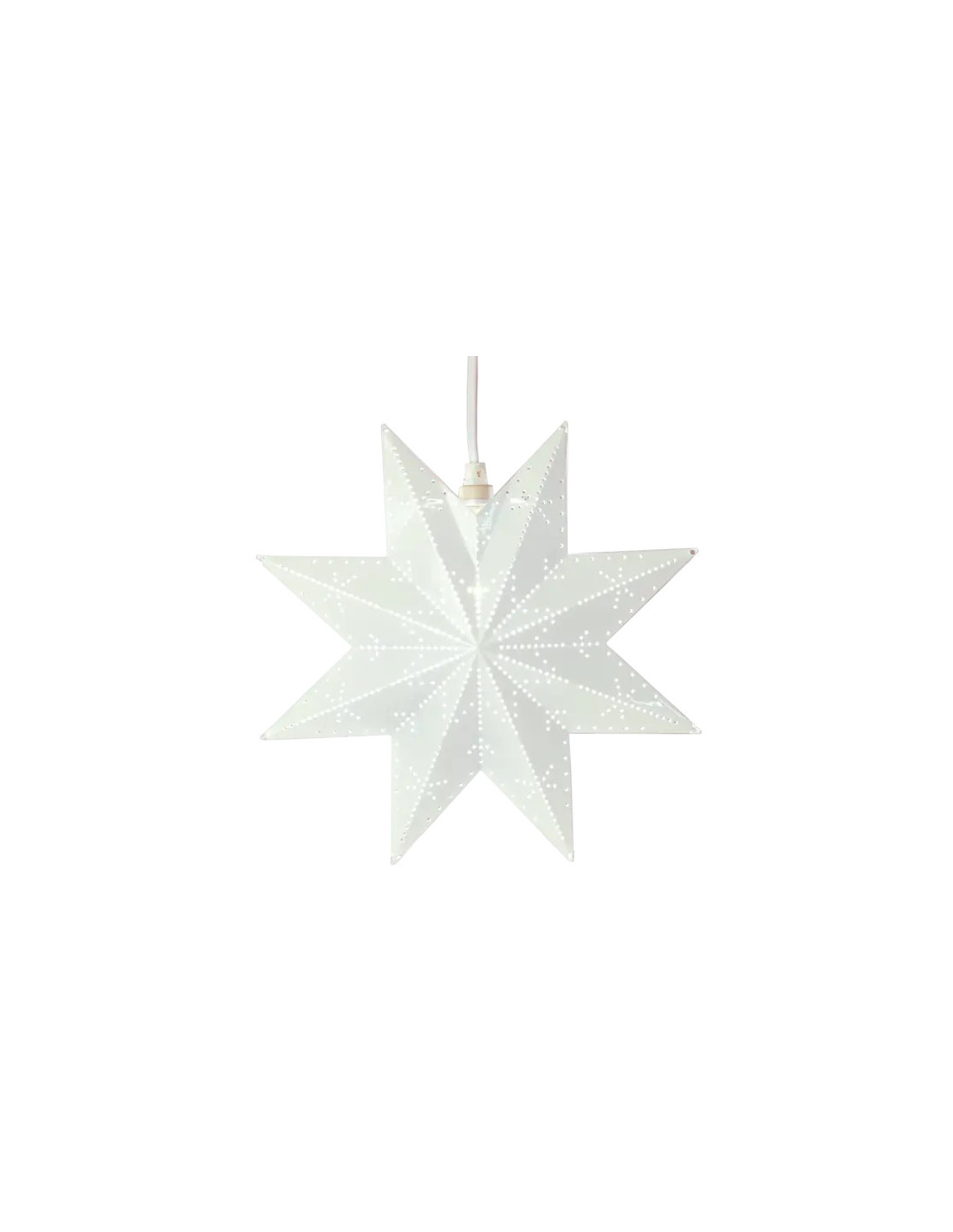 Vacker vit metallstjärna för inomhusbruk. Stjärnan har fina detaljer och plats för en ljuskälla.