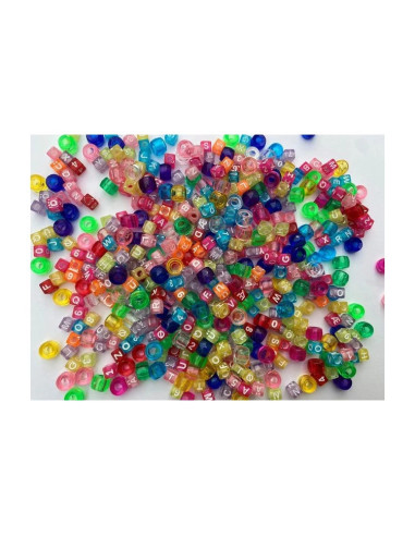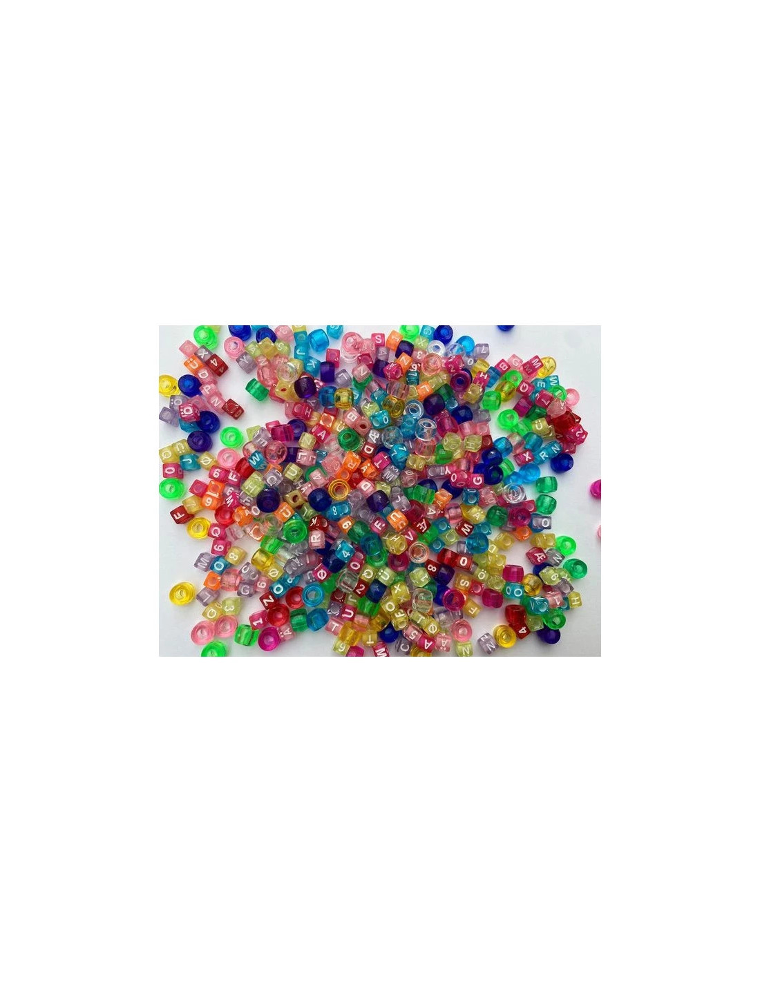 Transparenta pärlor i blandade färger med nordiska bokstäver och siffror.