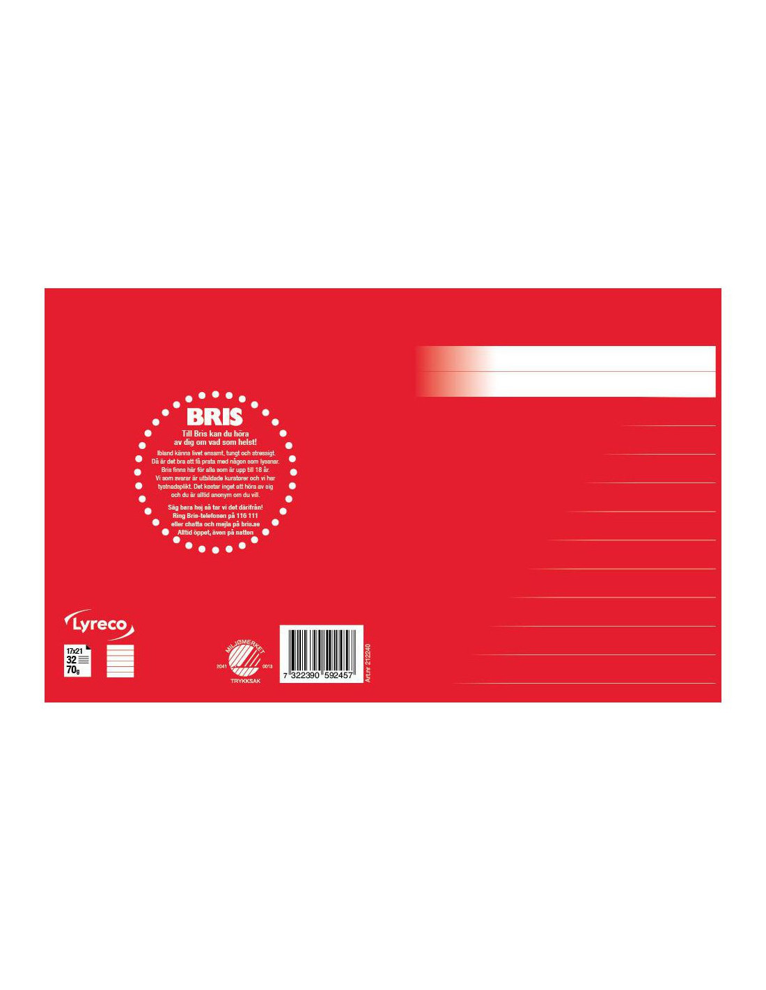 Ett svanenmärkt, linjerat, skrivhäfte med 14,5 mm linjeavstånd i ett format på 17 x 21 cm. Tillsammans stödjer vi BRIS genom att 5 öre per sålt häfte ur denna serie går direkt till BRIS, Barnens Rätt i Samhället.
