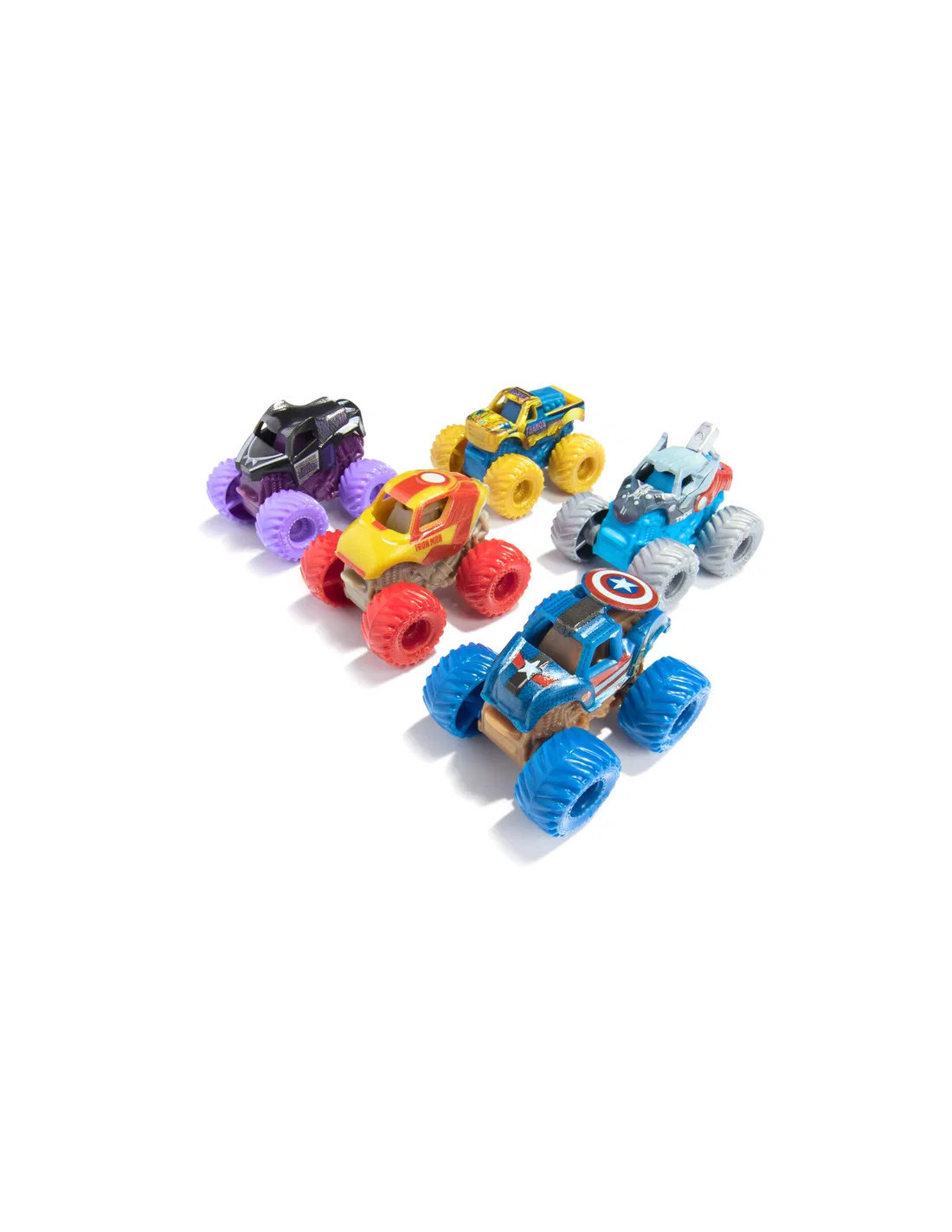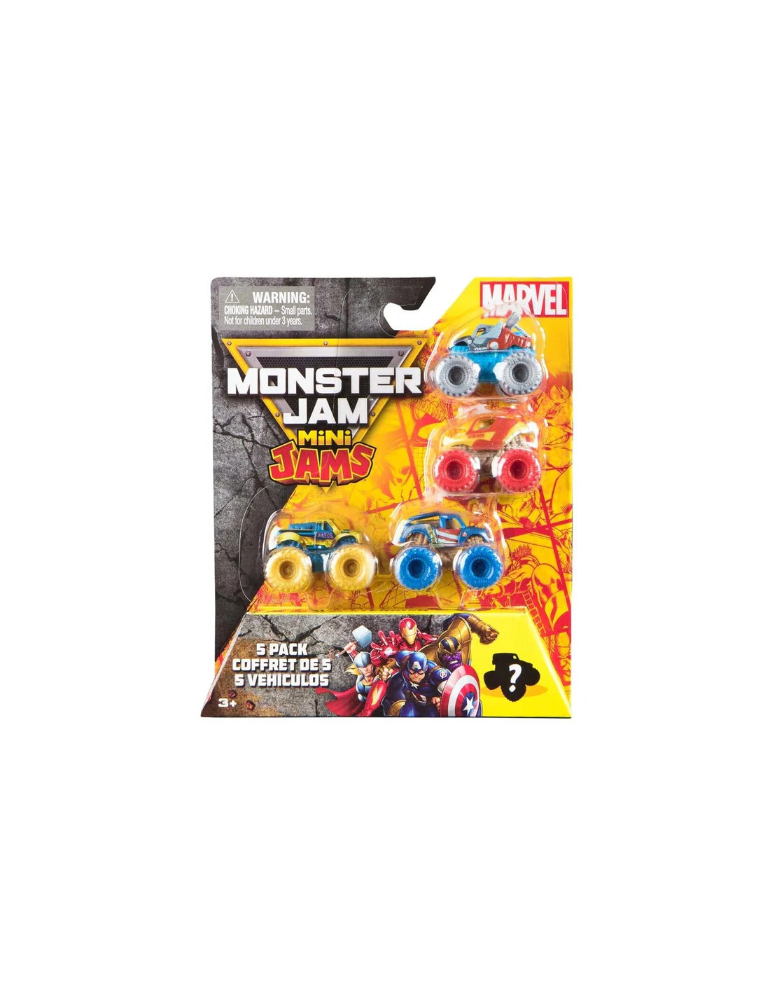 Skapa ditt eget mini-Avengers-evenemang i en helt ny skala med de officiella Monster Jam Marvel Mini 5-Pack trucks! Kompakta och smĂ„ â dessa monstertrucks i 1:87-skala Ă€r fulla av otroliga detaljer och redo för episk Monster Jam-action! Detta pack innehĂ„ller Iron Man, Captain America, Thor, Thanos och en Mystery Mini Truck! Riv upp Mystery Mini-förpackningen för att avslöja din truck â du vet inte vilken Monster Jam Mini som Ă€r dĂ€r förrĂ€n du öppnar den