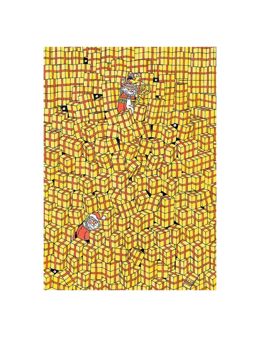 • Jultomten Ă€r omgiven av en rad likadana paket – undrar om alla hittar sin rĂ€tta Ă€gare?