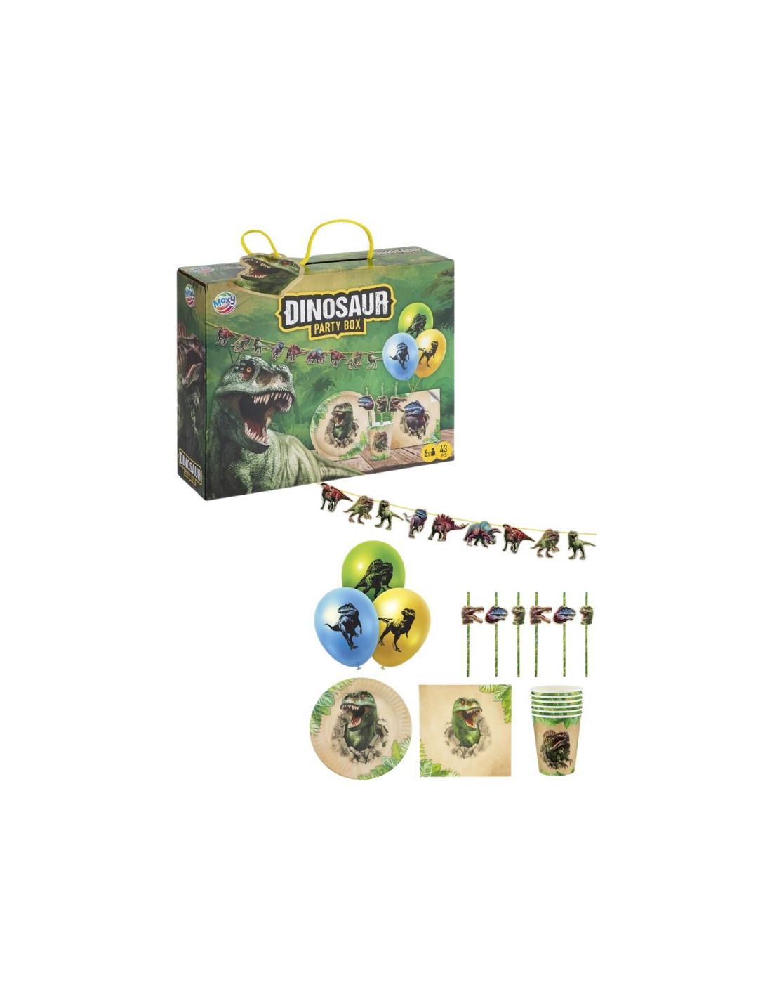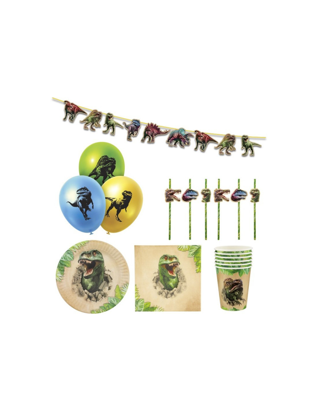 Fira barnet med tidernas dinosauriefest med detta paket ballonger och girlanger, papptallrikar, koppar, sugrör och servetter för 6 personer. Allt har fantastiska färger och motiv av dinosaurier.