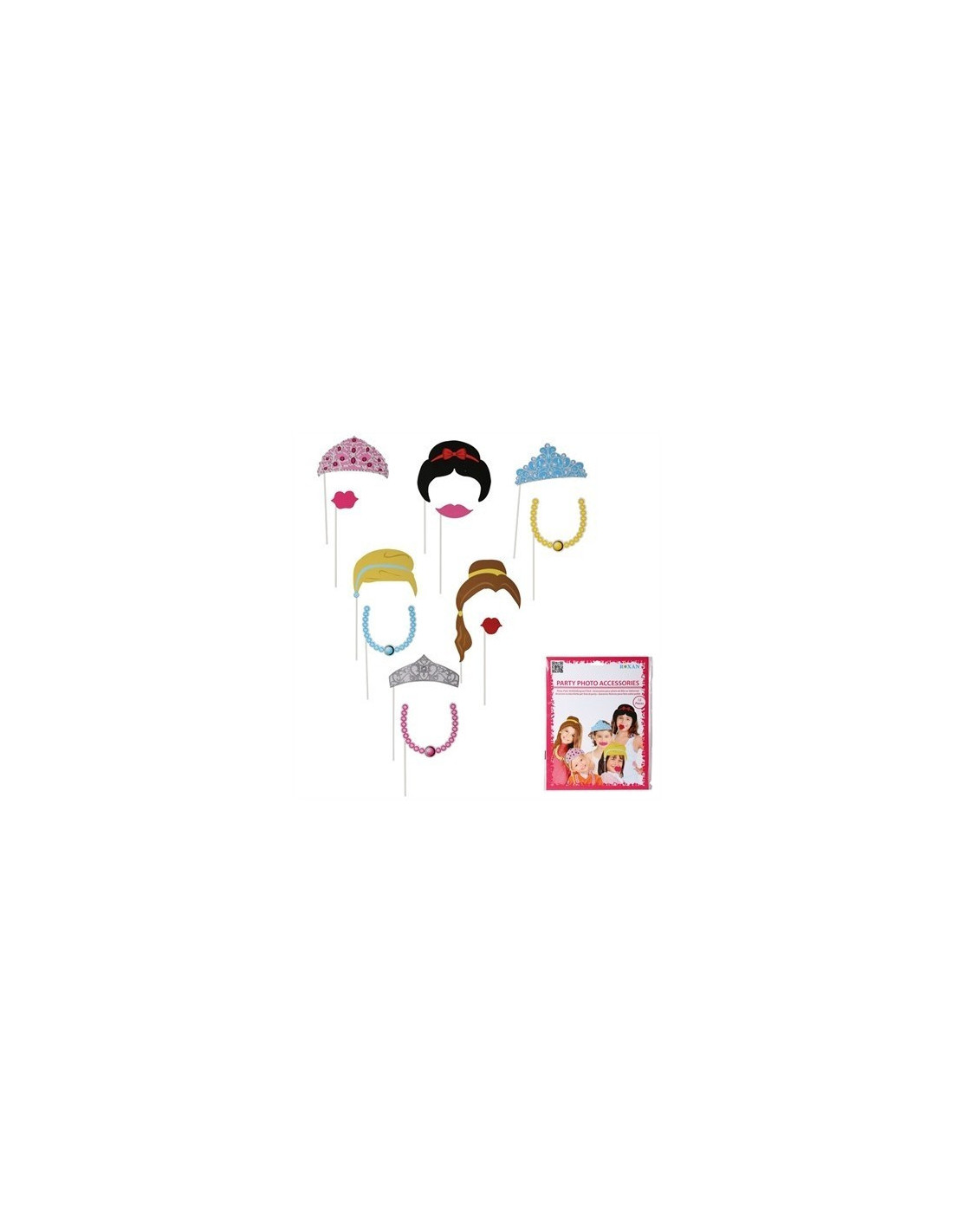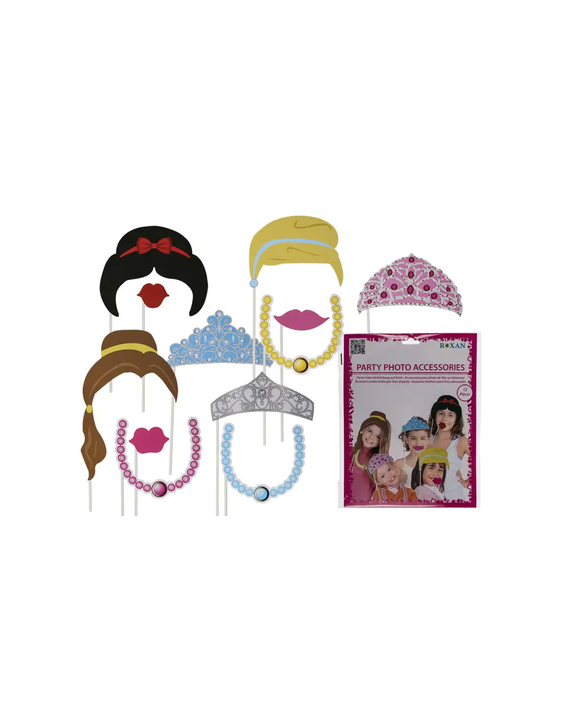 Set med tolv fÀrgglada kortpappersfototillbehör pÄ pinnar.