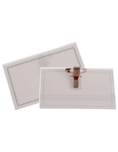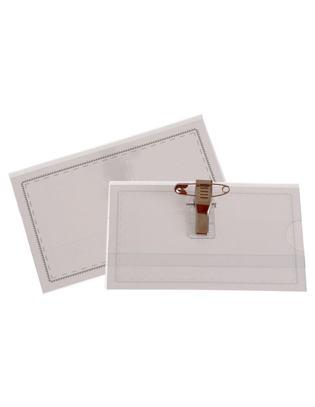 Namnskylt av genomskinlig plast med nÄl och klÀmma.