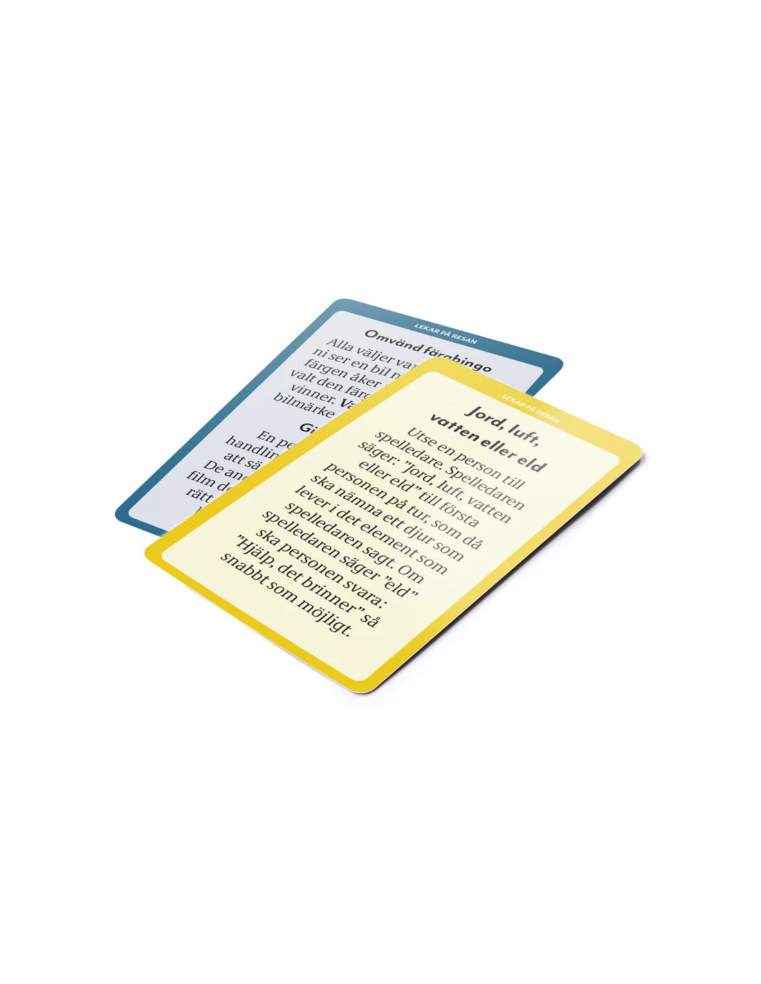 Från klassiska gissningslekar till hjärngympa och ordlekar, det finns något för alla. Kortleken är enkel att ta med sig överallt och är ett måste för alla resande familjer och vänner. Gör alla resor till minnesvärda upplevelser med våra lekar på vägen!