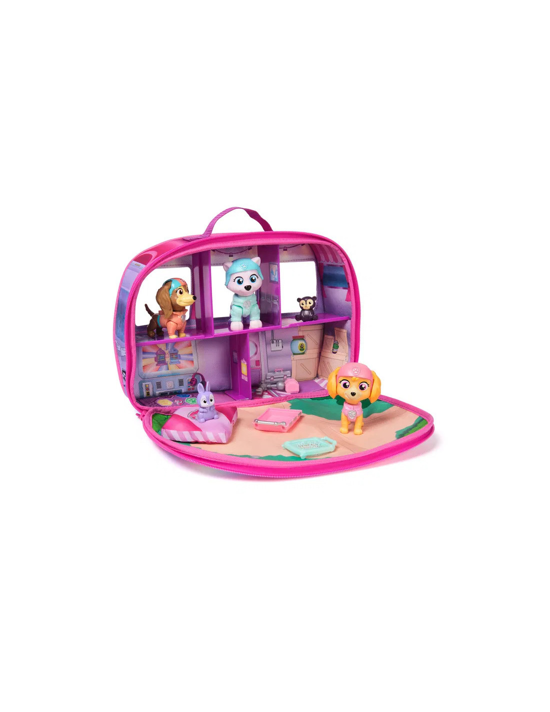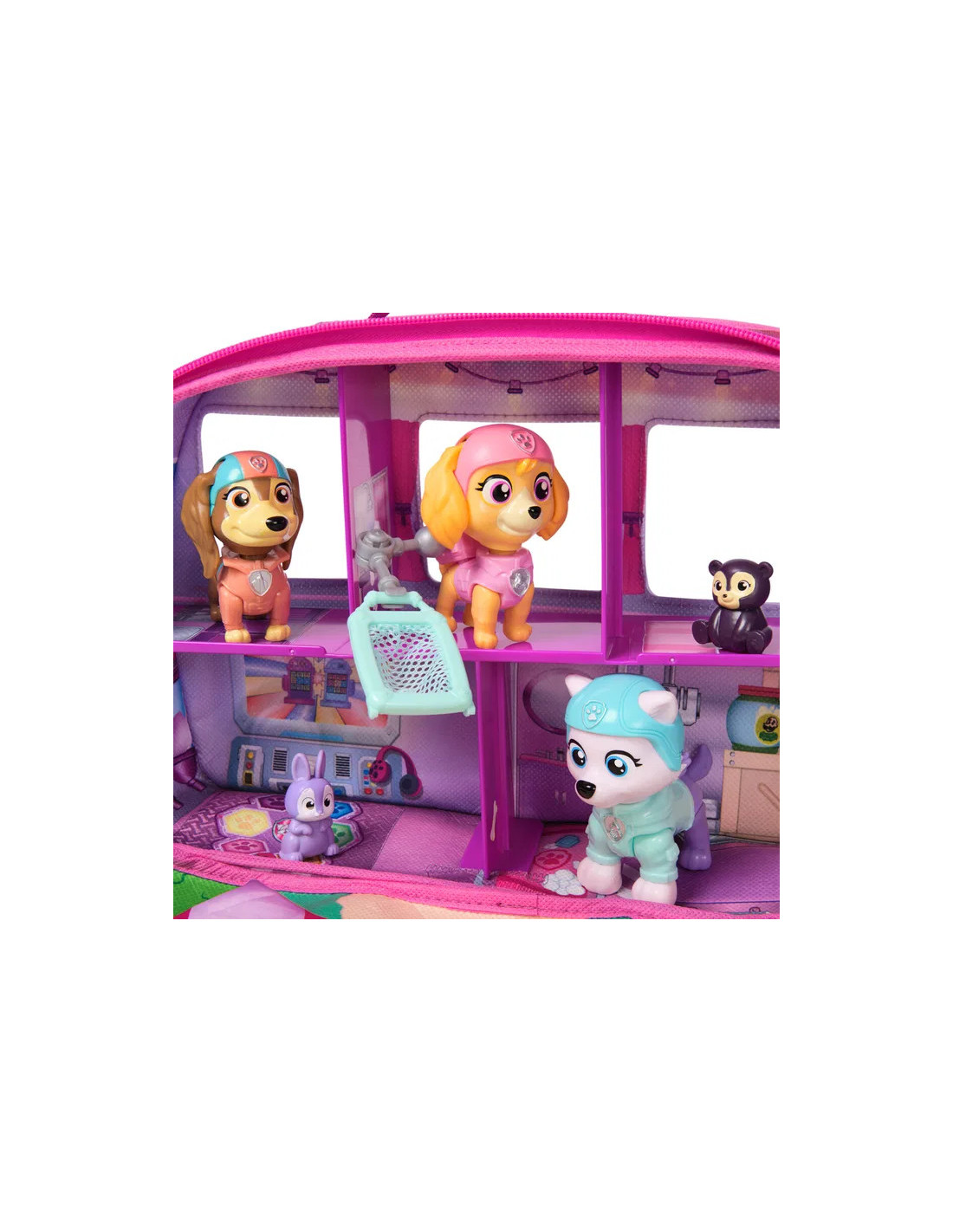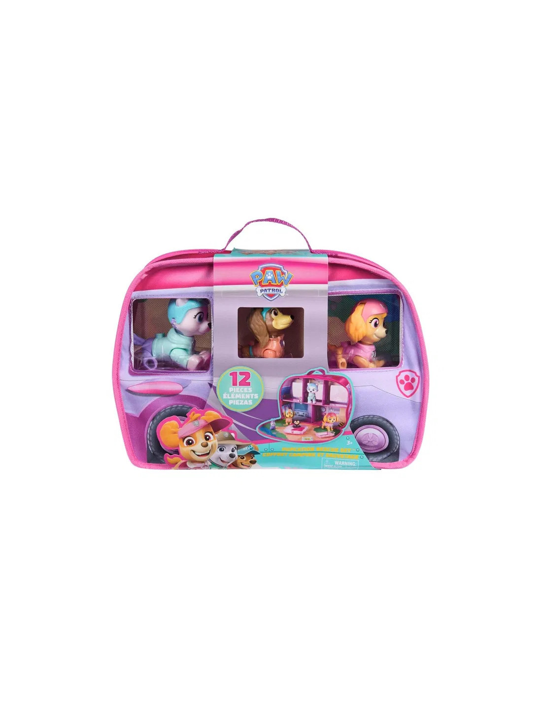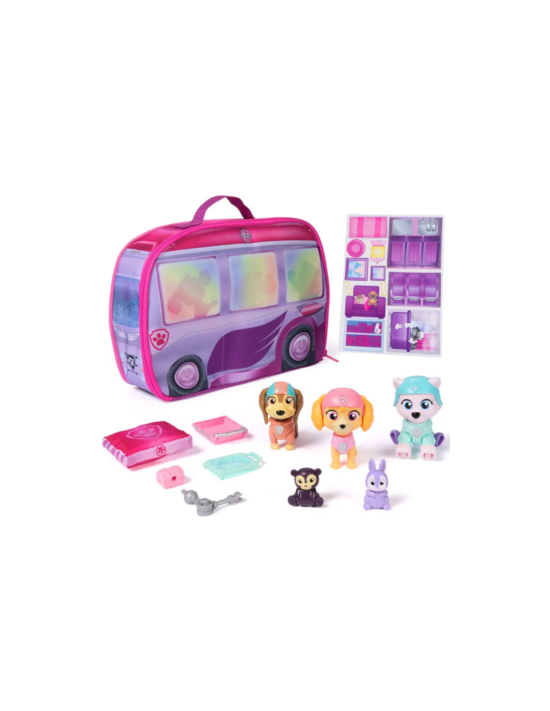 Ge dig ut pĂ„ spĂ€nnande Ă€ventyr med PAW Patrol Skyes World Pupcation Rescue Set och utforska en vĂ€rld av spĂ€nning och teamwork. Setet innehĂ„ller Skye, Liberty och Everest bobblehead-figurer med rörliga armar och ben samt deras söta björn- och kaninvĂ€nner. Den 30,4 cm stora tyg-husbilen öppnas och avslöjar fem rum och en parkmatta â PAWfect för picknick och lek. Barn kan anvĂ€nda krockkudden och den rörliga robotarmen för att skapa dynamiska rĂ€ddningsuppdrag, medan ryggsĂ€cken som rymmer bĂ„r och nĂ€t kan bĂ€ras av alla tre valpar. Efter en rolig dag förvandlas campern till en förvaringslĂ„da, vilket gör den enkel att ta med pĂ„ resor