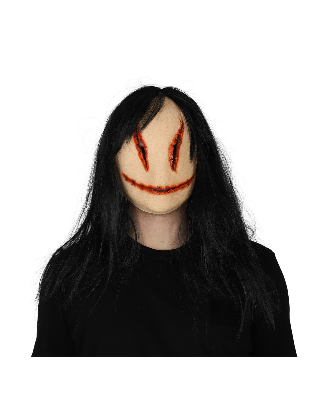 Latexmask som förestĂ€ller en skrĂ€mmande flicka med svart hĂ„r – en kuslig detalj som ger din utklĂ€dnad en intensiv och obehaglig kĂ€nsla. Perfekt för halloween och skrĂ€ckteman.