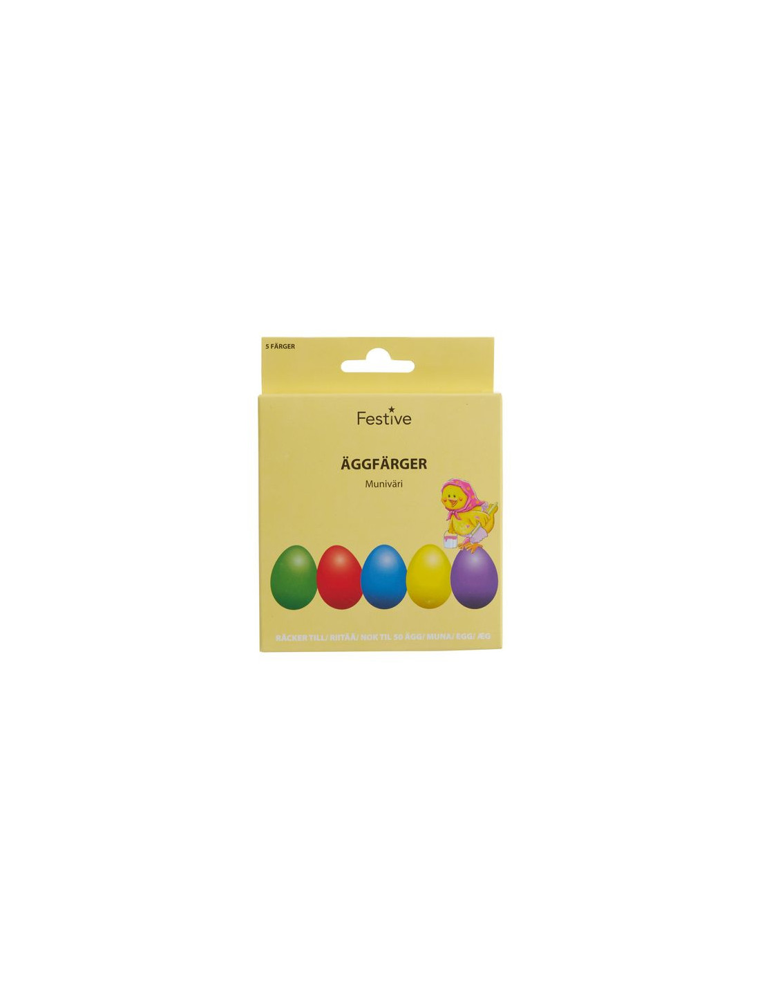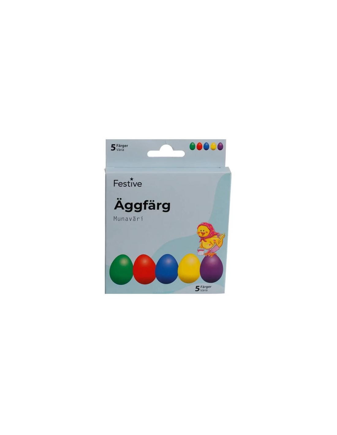 5 st. klara och starka färger för att förgylla påskens ägg med vackra färger! Vackra dekorationer till bords eller i ett påskris. Förpackningen innehåller fem färger: grön, lila, röd, gul och blå. Räcker till 50 ägg av normalstorlek. Livsmedelsgodkänt.