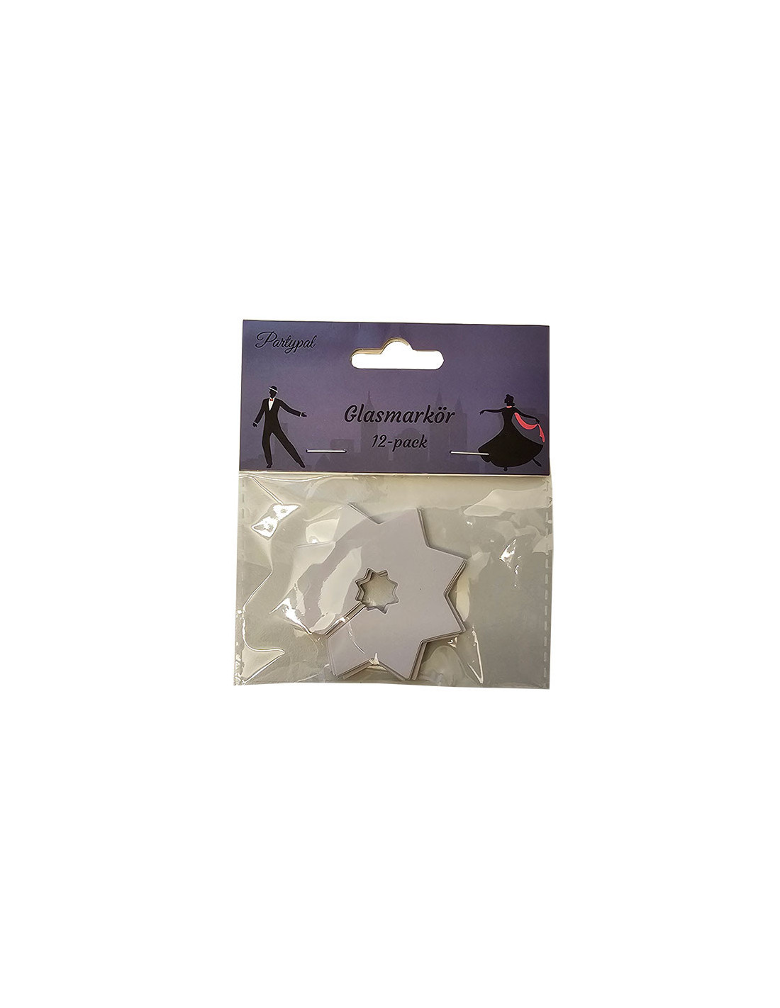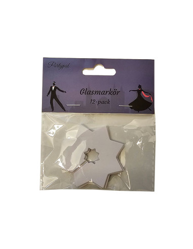 12 glasmarkörer i papper, att skriva gästerna namn på.