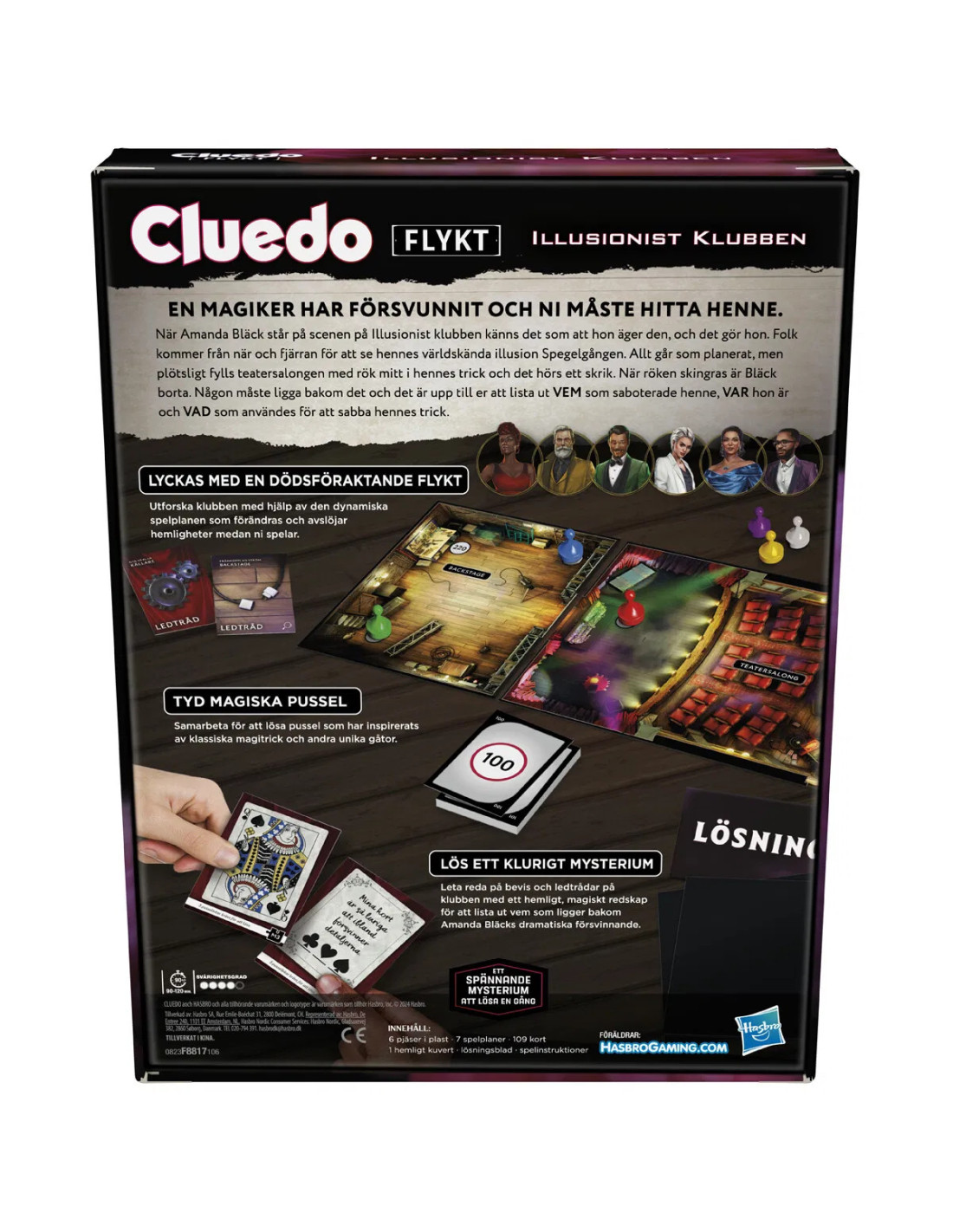 En känd magiker har försvunnit och ni måste hitta henne! När Amanda Bläck utför sin illusion Spegelgången fylls teatersalongen med rök och någon skriker. Bläck har försvunnit! Nu måste spelarna fly från magiklubben och lösa mysteriet i spelet Cluedo Escape: The Illusionist’s Club! Lista ut VEM som saboterade henne, VAR hon hålls fången och VAD som användes för att sabotera tricket. Escape Room-spelet inkluderar klassiska Cluedo-karaktärer och ett mysterium, och ni kan börja spela på en gång utan en massa förberedelser. Spelarna flyttar sina pjäser runt en spelplan som tar form rum för rum i takt med att de drar kort, löser pussel, låser upp rum och hittar ledtrådar. När spelarna har lyckats fly från klubben måste de gå igenom ledtrådarna som de har samlat in och använda sina slutledningsförmågor för att anklaga rätt person och vinna! Samla familjen för en oförglömlig spelkväll, med ett spännande spel som kan spelas en gång. Spelet är även en perfekt julklapp eller födelsedagspresent för de som gillar det ursprungliga Cluedo-spelet och mordmysteriespel