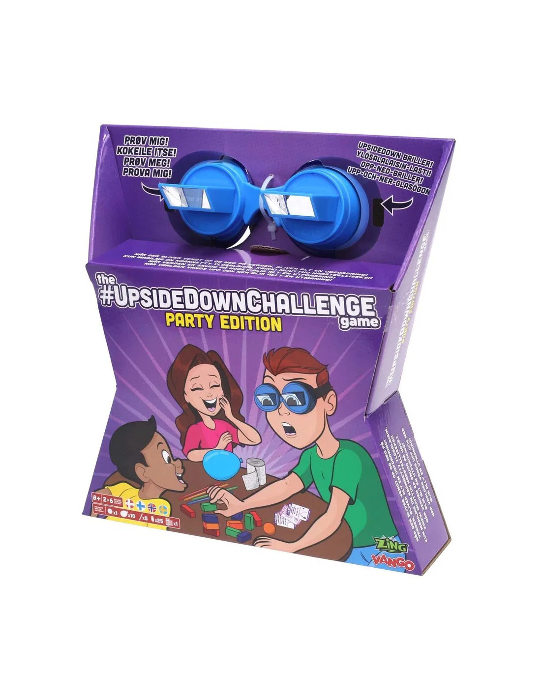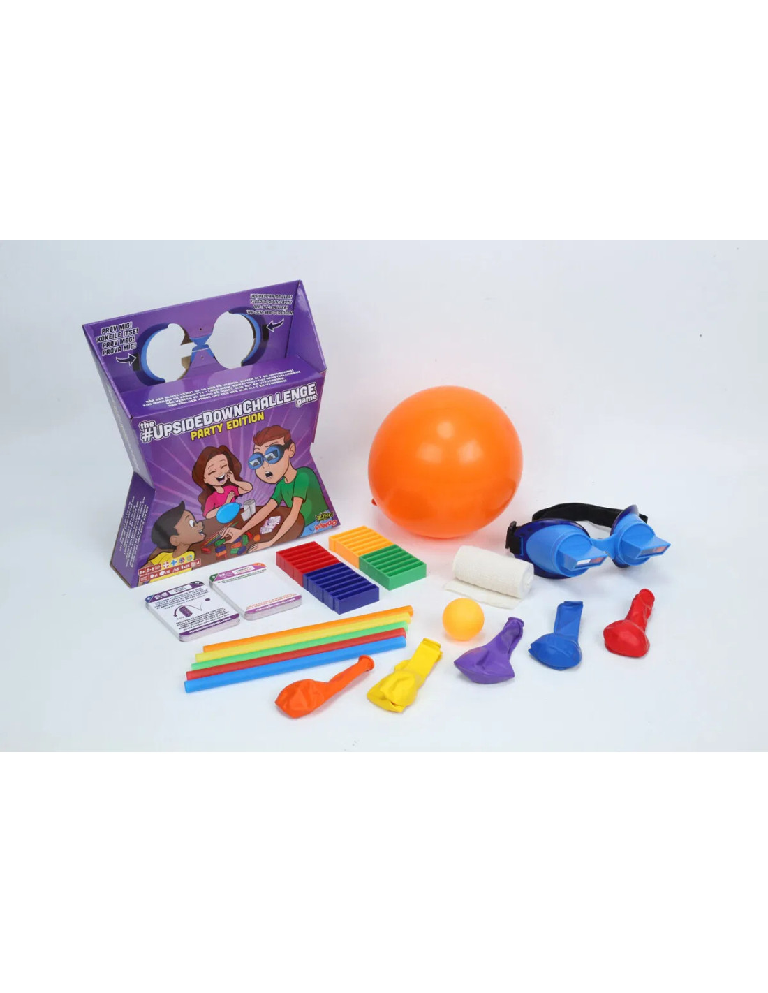 Innehåll: 1 par upp-och-ner-glasögon, 25 klossar, 10 ballonger, 1 bordtennisboll, 5 pinnar, 1 bandage och 30 utmaningskort.
