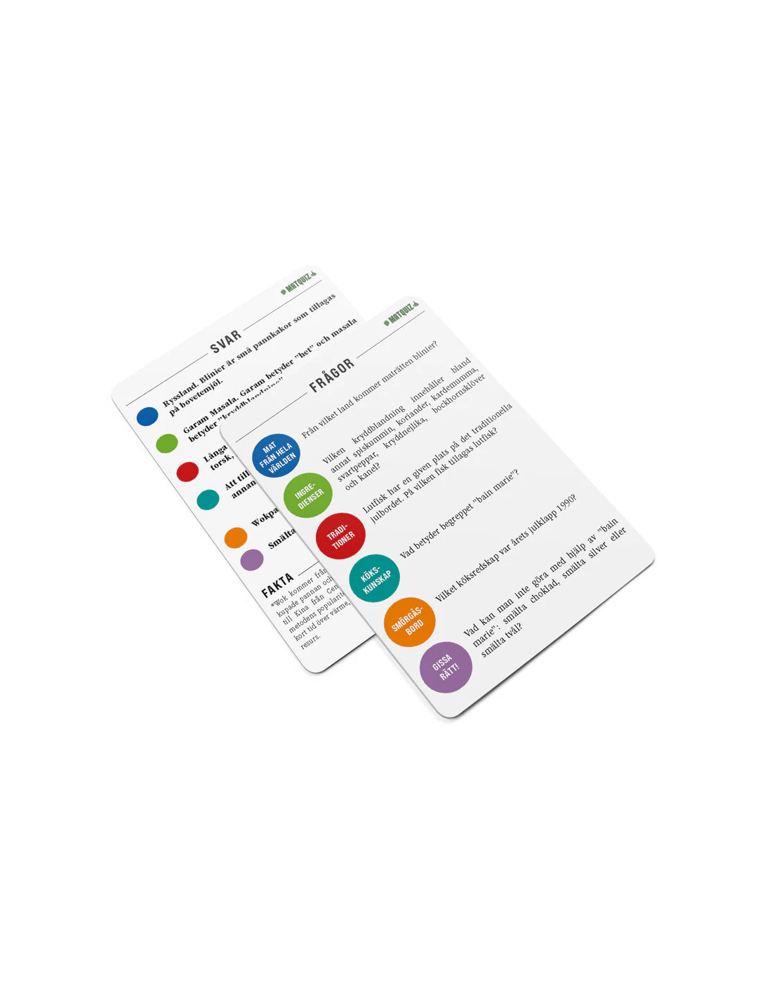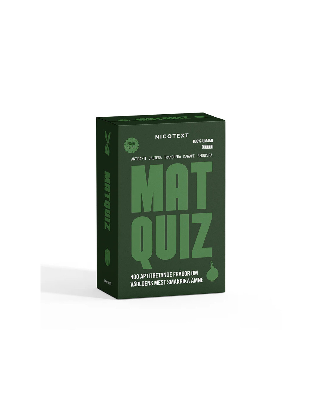 I Matquiz får du svara på kluriga, roliga och ibland oväntade frågor om allt som hör köket till – från världens matkulturer och traditioner till råvaror, teknik och smak. Frågorna är uppdelade i sex kategorier. Med varierande svårighetsgrad passar spelet lika bra för hobbykocken som för mästerkockarna. Fylld med kunskap, skratt och aha-upplevelser – Matquiz är den perfekta ingrediensen för en smakrik spelkväll.