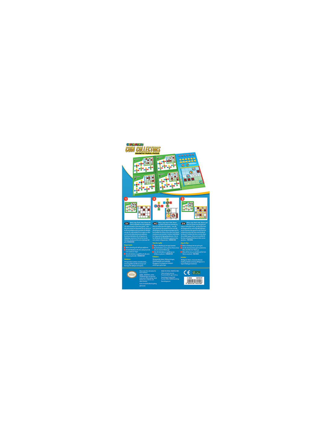 Ravensburger Super Mario Travel Game är ett resespel där spelare löser ledtrådar för att placera mynt på rätt plats i en spelplan med karaktärer som Mario, Luigi och Peach. Spelet kombinerar logik och strategi för att klara av 40 utmaningar och är perfekt för resan.