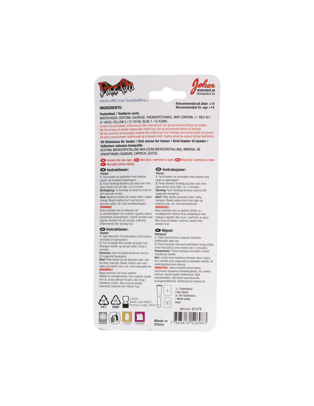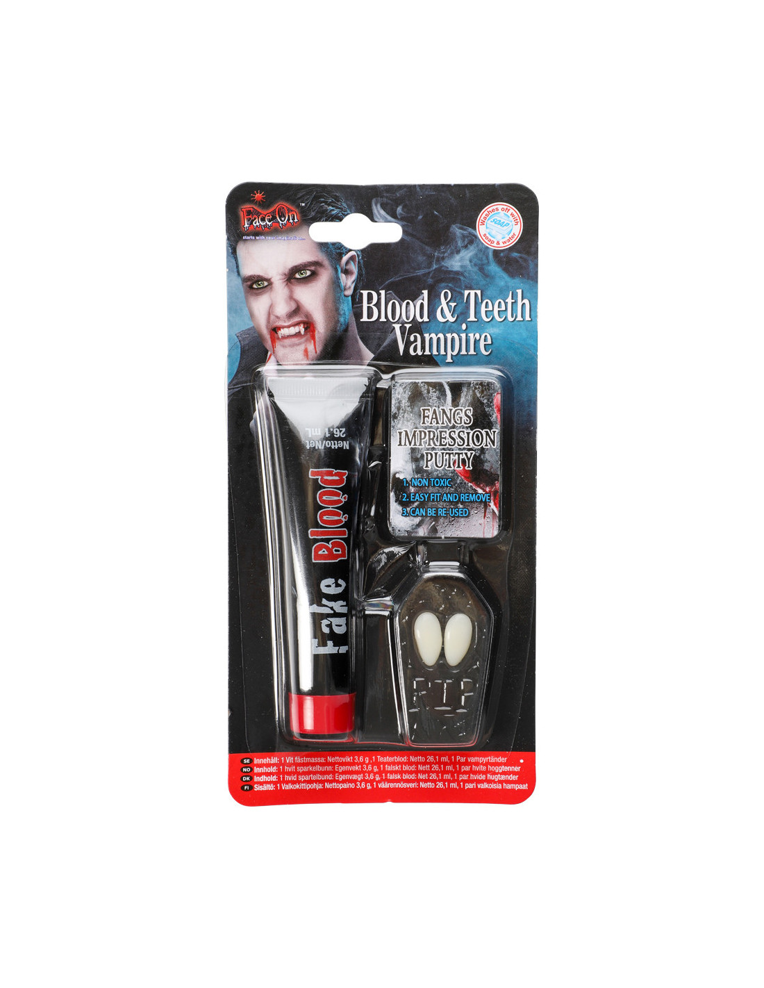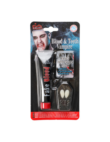 Vampyrkit med fakeblod och tänder! Innehåller: 1 Fake Blood Net 2.1mL/0.88 Fl.OZ , 1 Putty base Net 3.6g / 0.13 OZ, 1 pair fang
