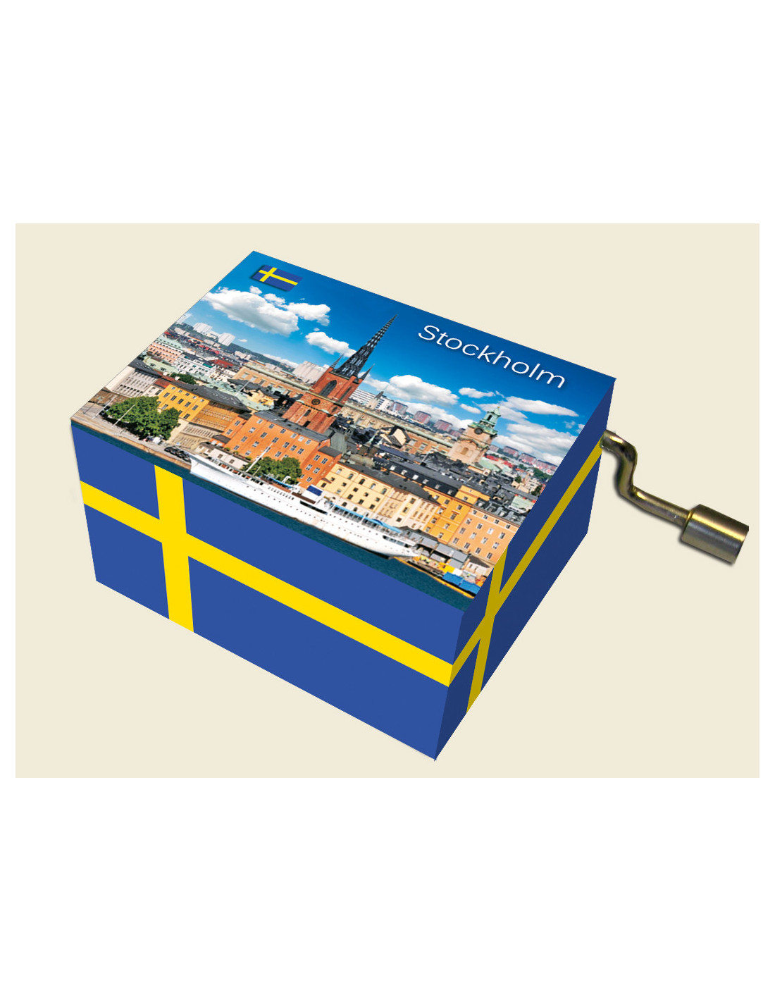 Trevlig och annorlunda souvenir! Engelsk, fransk och tysk text anger att melodin Àr den svenska nationalsÄngen och pÄ dessa sprÄk beskrivs Àven bilden pÄ framsidan. Speldosornas mÄtt: 5,8x4,5x3,0 cm.