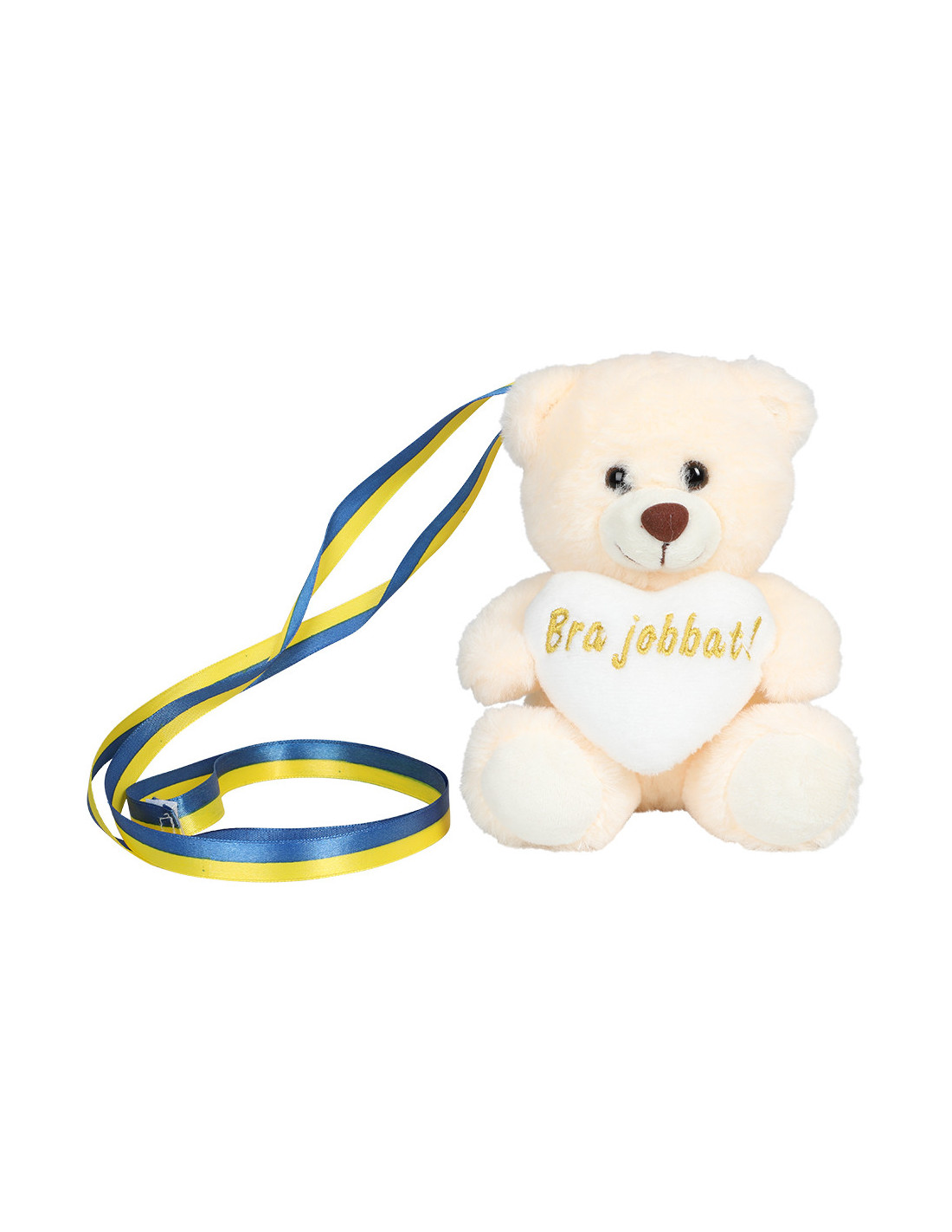 En mjuk nalle med hjÀrta dÀr det stÄr "bra jobbat", perfekt som studentpresent. Med sitt praktiska halsband kan den enkelt hÀngas runt halsen under firandet.