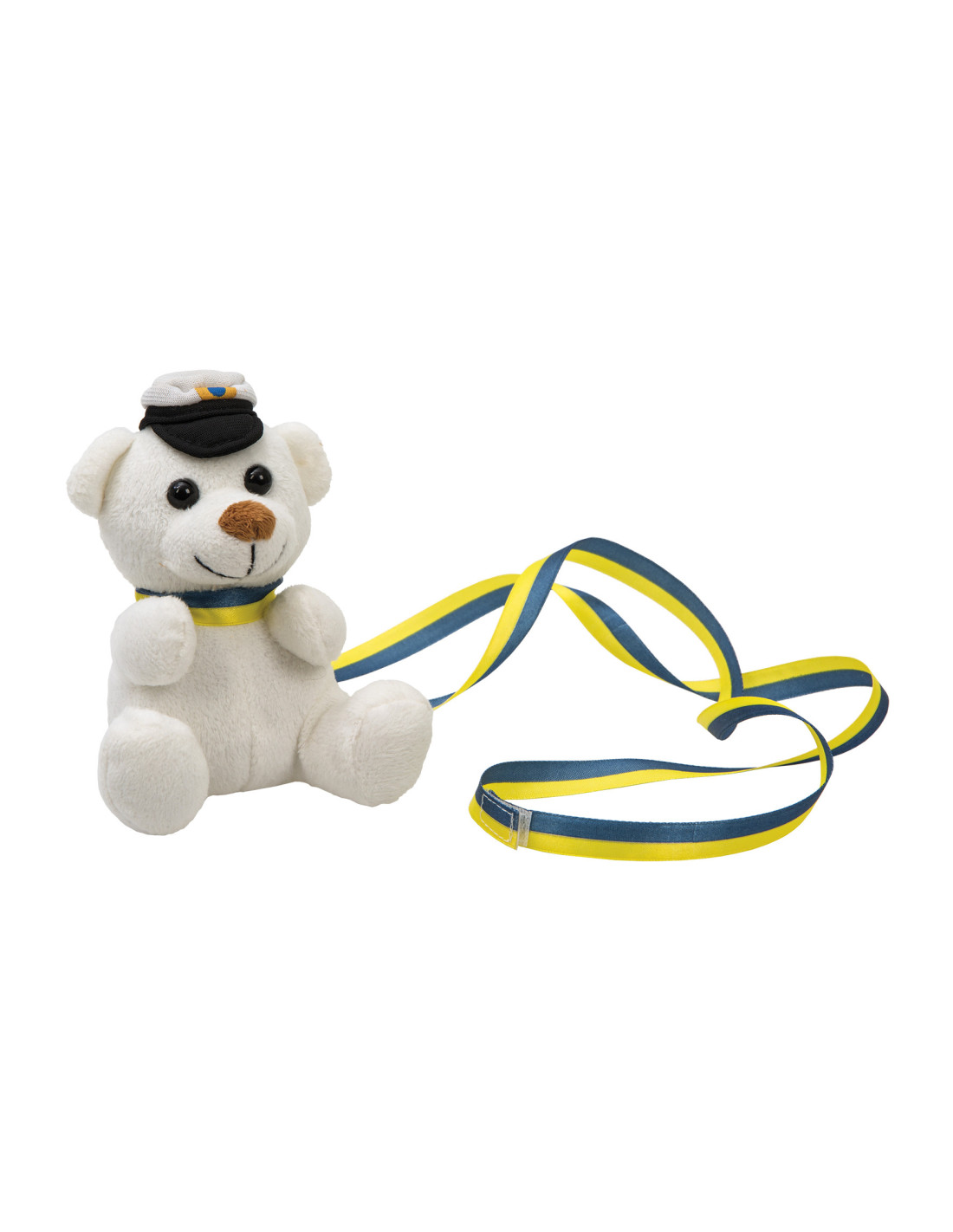 Nalle tillverkad av polyester och ögonen av plast. BlÄgult band medföljer. 12 cm