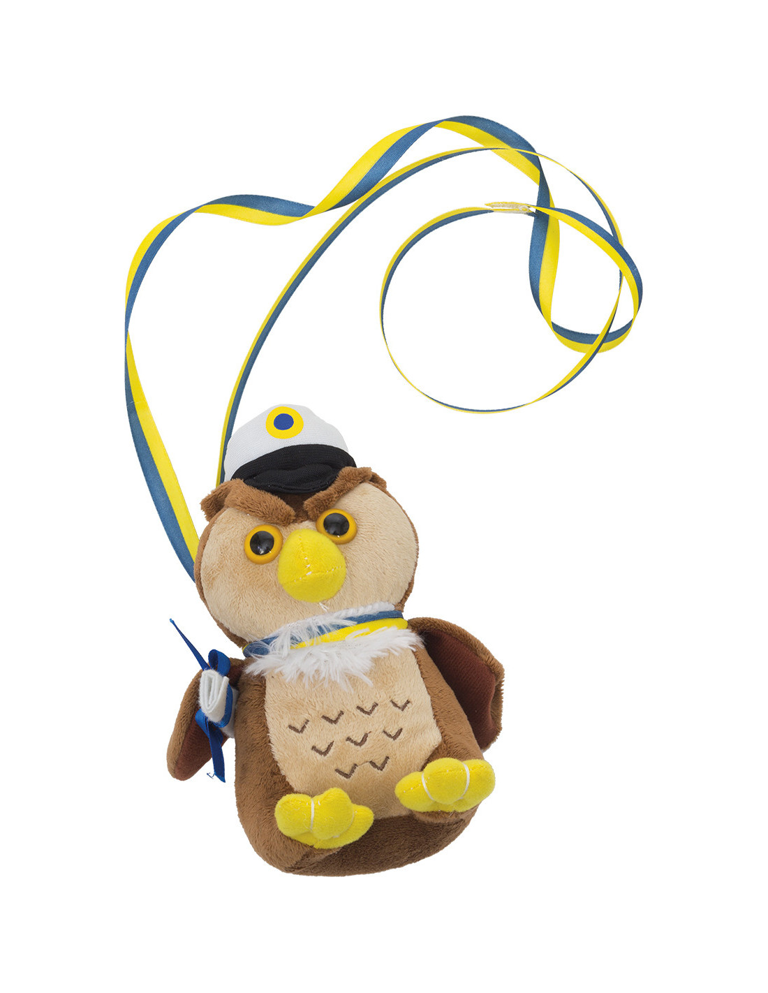 Nalle tillverkad av polyester och ögonen av plast. BlÄgult band medföljer.