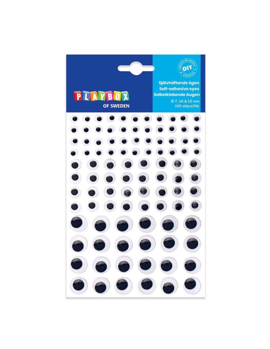 Svartvita ögon i tre olika storlekar. Ögonen är självhäftande så du behöver inget lim för att fästa dem.