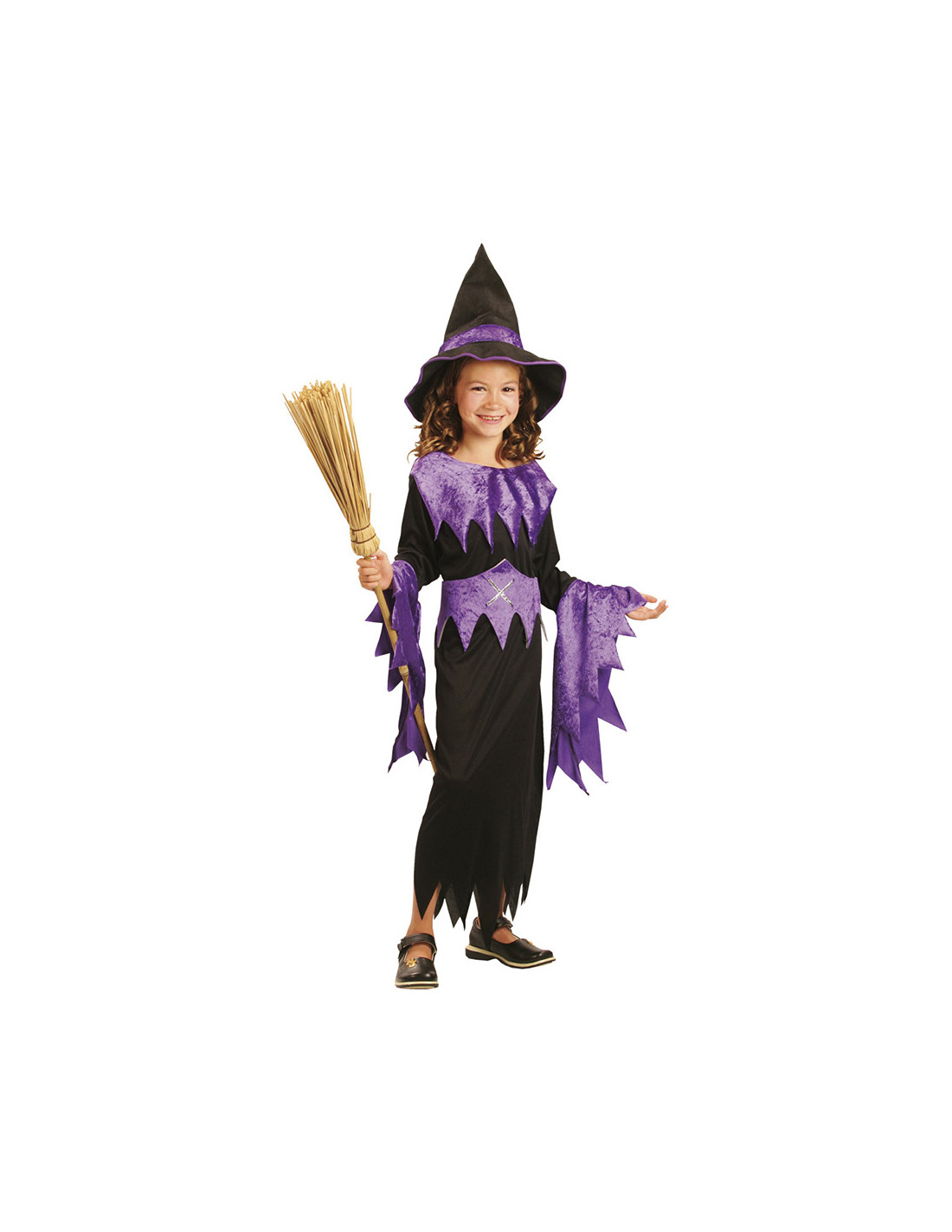 En häxklänning med tillhörande hatt, i svart och lila som passar perfekt på halloweenfirandet!