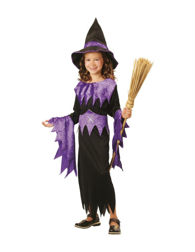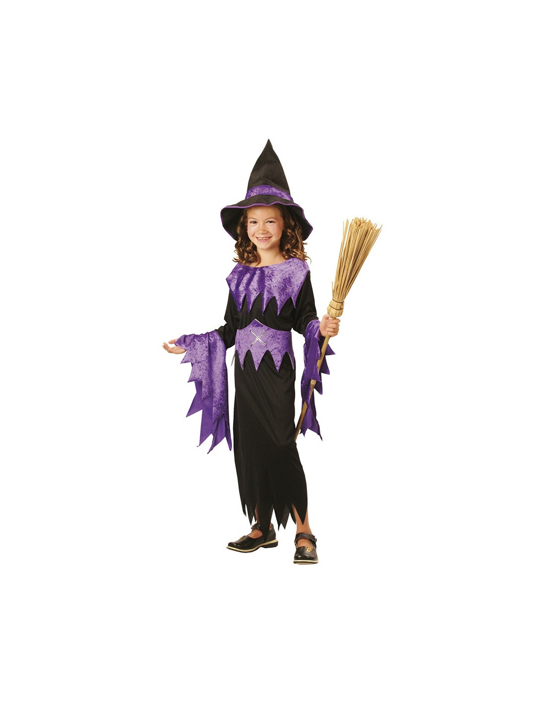 En häxklänning med tillhörande hatt, i svart och lila som passar perfekt på halloweenfirandet!